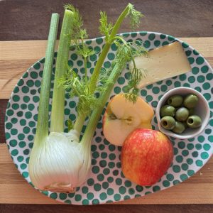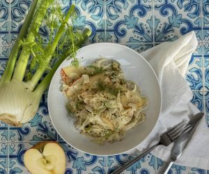 - Using a mandolin (!!) or a food processor with the slicing disk, shave the fennel and the apple. Add to the bowl with the dressing.